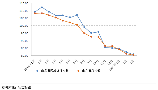 2016年山东省区域银行收益率指数持续下跌,但整体波动却不明显,与2015年一季度波动情况有较大区别。山东省区域银行指数1月下滑了2.23点,2月下滑了0.8点,3月则下滑了1.53点。2016年1季度,山东省区域性银行同比下滑了26.36%。整体收益率指数下滑表现明显。山东省总指数下滑幅度与该地区区域性银行表现近似,这反映了山东省区域性银行在该地区影响力较大,因此山东省总指数变化情况与其区域性银行变化情况接近。