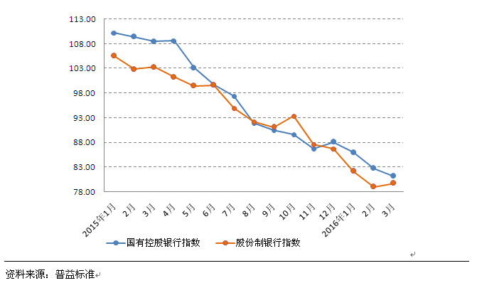 在进入2016年后,股份制银行收益率指数的下滑幅度较大,不过在3月,保本类产品收益率指数的抬升促使股份制银行收益率指数有微幅反弹,整体趋稳的态势较为明显。国有银行收益率指数在1、2月下滑幅度相对较低,不过3月中仍然维持下滑趋势,环比下滑1.86%,下滑幅度继续减小。整体表现来看,3月全国性银行收益率指数均透露出趋稳的信号,预计4月大幅下滑可能性较小。