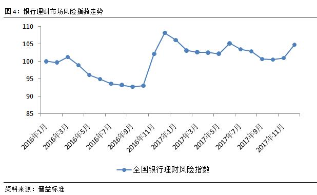 12月银行风险指数大幅上涨,环比上涨3.77点至104.74点。银行理财风险的上涨与短期因素的影响有较大关系。由于2017年MPA和LCR的考核收严,且考核的时点性较强,无疑促使银行理财的表现更有时点性。而冲时点等情况的发生必然不利于银行的风险控制,也不符合监管一直提出的稳定风险的大方向,因此预计未来相关考核方式或有所调整以降低时点效应对银行风险的影响。