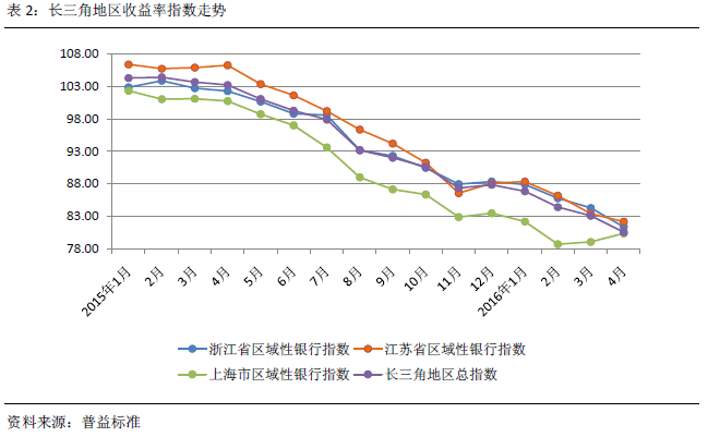 从收益率指数走势图可以看到,进入2016年后浙江省与江苏省收益率指数基本保持了与长三角地区相似的变化,维持平稳的下滑趋势,而上海市区域性银行收益率指数则有明显的变化。在2016年年初大幅下滑且触及到1年内最低的78.71后,上海市区域性银行收益率指数出现了明显的反弹,在4月中,上海市区域性银行收益率指数环比上升了1.62%,继续维持上扬趋势。而4月中,江苏省区域性银行收益率指数虽然仍然保持下滑趋势,但整体下滑幅度明显放缓;浙江省区域性银行收益率指数则继续维持小幅下滑的态势没有明显改变。虽然上海市区域性银行收益率指数有较明显的上升,但其理财产品在长三角地区所占权重较低,因此长三角地区总指数仍然维持了小幅下滑的态势。