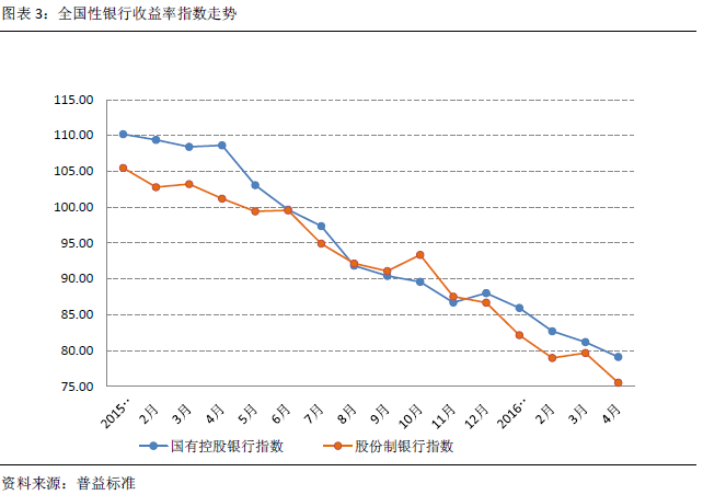 在2016年中,国有控股银行收益率指数仍然维持了较为稳定的表现,整体波动较小。4月中,国有控股银行收益率指数环比下滑2.55%,较三月下滑幅度有微幅增加,整体向下表现较难在短期内有所调整。股份制银行收益率指数在2016年中波动相对较大,3月中股份制银行收益率指数环比有所上升,但在4月中出现了一波明显的下滑,环比下滑5.21%至75.51。全国性银行整体向下的表现较为明显,结合当前经济新常态以及银行资管控规模、控收益的需要,全国性银行收益率指数近期大幅反转的可能性较低。