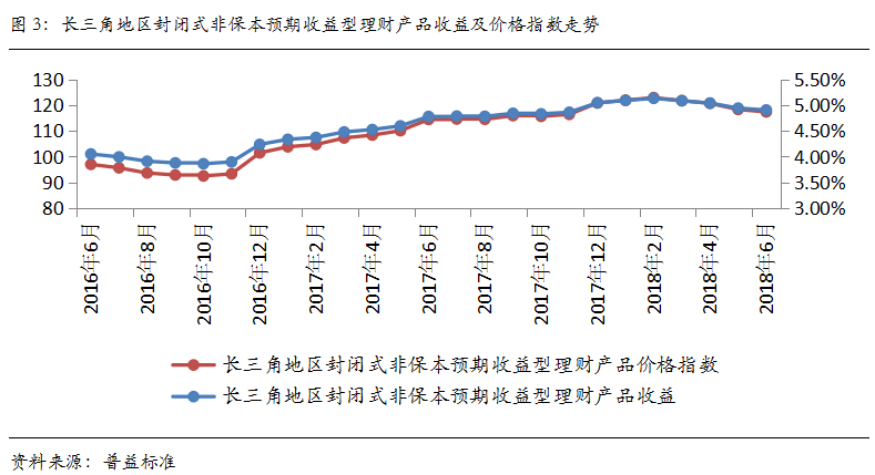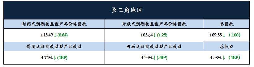 本月长三角地区封闭式非保本预期收益型产品收益环比下降4BP至4.91%,相应价格指数环比下跌0.95点至117.46点,跌幅较上月有所收窄。