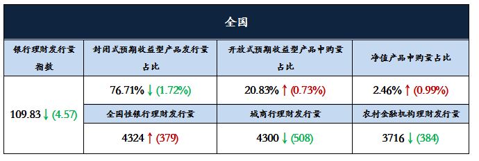 全国银行理财发行指数跌幅略有扩大,环比下跌4.57点至109.83点