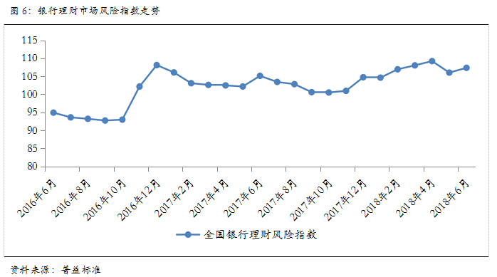 本月全国理财风险总指数上行1.33点至107.36点,上行幅度较大,显示在经济数据不及预期、中美贸易冲突、股票市场大跌、信用违约风波等风险事件的冲击下,总风险水平增长。同时,在6月20日的国务院常务会议、6月27日召开的第二季度货币政策委员会例会中,均以流动性“合理充裕”替代“合理稳定”,流动性的合理宽松也为市场吃下了“定心丸”。