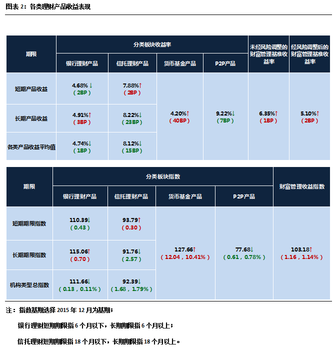 信托理财收益指数环比下滑1.68点达92.39点。信托收益的小幅回落与当月的流动性环境趋于宽松有一定的关系,从长期趋势来看,由于目前收益较高的房地产信托持续火热,整体收益或仍有上行空间。但房地产信托高收益带来的兑付风险也值得行业警惕。