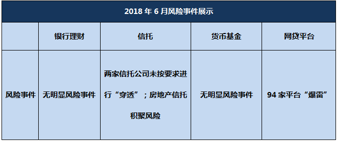 在历经一年的理财乱象整治之后,6月银行理财无风险事件曝出。在资管新规后,除部分大型银行较快的推动产品净值化转型外,更多的银行将新规后第一阶段的重心放在了处理存量资产上。同时考虑银行理财监管细则尚未公布,较多银行对未来理财业务的发展方向仍持观望态度,因此业务开展相对保守,整体风险事件爆发的可能性较小。货币基金虽然继续保持无风险事件曝出,但近1年的监管环境持续收严也造成了货币基金增速大幅趋缓,整体发行趋于停滞的状态。从当前行业发展的趋势来看,在资管新规的引导下,未来市值法的货币基金或将逐步兴起,使收益与风险的关系回归正轨。不过市值法货币基金产品收益的不稳定性与当前货币基金目标群体的风险偏好有一定的偏差,投资者是否能够接受此类产品还尚未可知。6月,多家信托公司遭到监管罚单,其中国投泰康信托与中国金谷国际信托由于未按监管要求对底层资产或最终投资者进行识别受到了北京银监局的处罚,凸显资管新规后穿透监管将成为监管层的重点盯防区域。另一方面,6月房地产信托仍然是集合信托的发行主力,这反映了房企旺盛的融资需求和该类型业务的较高利润。但过于集中的投向大幅拉升了信托公司面临的风险,信托公司应警惕可能出现的违约浪潮。6月P2P行业迎来了爆雷潮,单月94家平台出现风险事件。事实上自2016年8月网贷暂行办法出台后,近两年的行业治理是推动P2P行业发展整体向好的。但在底层资产逐渐变差的过程中,相对于传统金融机构更为严格的合规规范要求及更强的风险把控能力,前期粗放式发展的P2P行业展现出了明显的弱抗风险特性。考虑到风险在行业中的传导效应,建议投资者短期内谨慎投资。