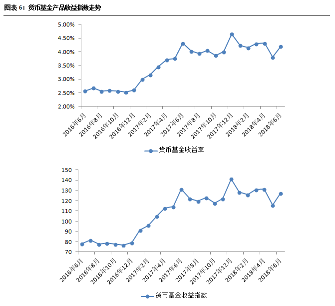 2018年6月,P2P平台产品收益率持续下滑,环比下滑7BP,至9.22%。从收益变化来看,6月爆雷潮促使一大批高收益的P2P产品被清理出场,导致当月收益下滑幅度进一步扩大。考虑到此次爆雷事件对于整个行业的影响或将持续一定的时间,短期内P2P收益大概率呈现持续下行走势。从2018年上半年的收益变化趋势来看,信托理财产品收益呈现出持续上涨趋势,不过6月收益出现小幅回落,环比下滑15BP,至8.12%,信托收益的小幅回落与当月的流动性环境有一定的关系,从长期趋势来看,由于目前收益较高的房地产信托持续火热,整体收益或仍有上行空间。银行理财产品收益在6月表现稳定,仅环比下滑1BP至4.74%。在降准及其它货币市场工具的共同应用下,6月相对宽松的流动性环境保证了银行理财收益没有出现季末冲高的现象。但整体来看,虽然短期的月内流动性相对宽松,但跨季流动性的压力仍促使长期理财收益小幅上涨。2018年6月,货币基金收益在5月巨幅下挫的情况下大幅反弹,环比上涨40BP至4.20%。货币基金收益的上涨一方面是受年中时点流动性收紧预期的影响,令一方面也是对冲5月超预期的下跌表现,将整体收益走势拉回正常的下行通道。可以看到,6月货币基金收益仍处于4月之下,展现出了符合市场流动性变化的收益走势。