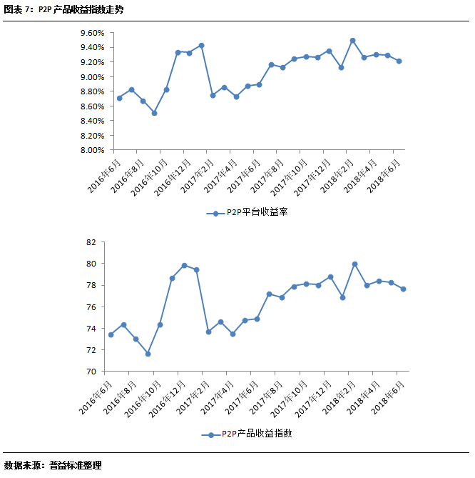2018年6月,P2P产品收益环比下滑7BP至9.22%,收益指数相应下滑0.61点至77.68点。从当前P2P产品的收益指数变化趋势来看,产品收益的波动持续收窄,凸显出近两年来监管收严的成效。但与此同时,6月P2P行业爆雷事件的持续增加凸显出P2P行业由于自身合规规范要求偏弱、风险控制能力较差等特点造成的弱抗风险特性。考虑到爆雷潮大幅降低了投资者对于该行业的信任感,因此不排除短期内部分平台出现挤兑现象,进而造成风险事件的进一步扩大。不过另一方面,从产品收益层面考虑,爆雷的P2P平台所给出的预期收益通常过高,增大了兑付风险,随着这些平台的退出,行业收益或将进一步回落。