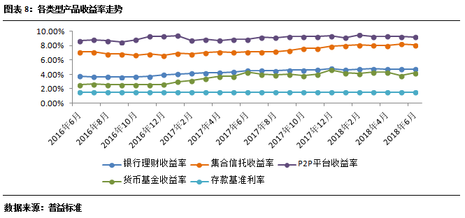 2018年6月,随着央行再次定向降准,缓解了市场的流动性压力,带动银行理财、信托等产品收益下降,但由于货币基金收益的大幅反弹,促使财富管理基准收益维持上行走势。当月银行理财收益环比下滑1BP至4.74%;货币基金大幅反弹,环比上涨40BP至4.20%;信托理财产品收益小幅下滑至8.12,环比跌幅达15BP;P2P产品收益加速回落,环比下滑7BP至9.22%。