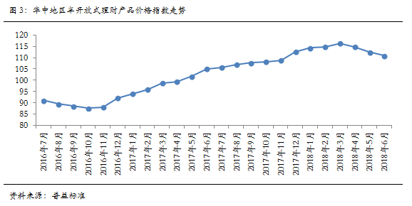 从价格指数表现来看,本月华中地区银行理财价格指数环比下降1.06点至109.25点。其中,封闭式预期收益型产品价格指数环比下跌0.74点至114.62点,开放式预期收益型产品价格指数环比下跌1.53点至101.20点。