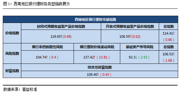 西南地区银行理财风险指数是由目标银行承担的隐形风险、产品的价格波动风险以及投资于基础资产传递的风险三类风险加权所得,主要反映了银行理财市场的整体风险状况。该指数越大说明对应市场的风险也越高,反之则风险越低。