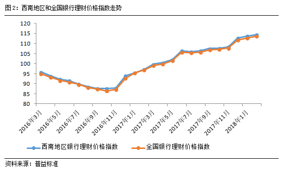 2月西南地区及全国银行理财价格指数表现出了趋近走势,西南地区理财产品整体收益表现仍然优于全国平均水平。