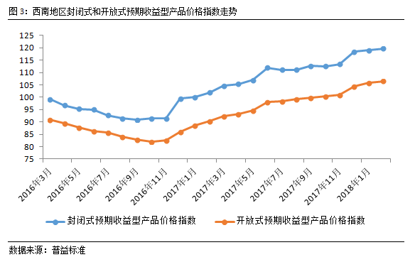 两类理财产品价格指数走势相仿。2月,西南地区封闭式和开放式预期收益型产品价格指数走势较为相似。其中,封闭式产品价格指数环比上涨0.68点至119.65点,涨幅幅为0.57%;开放式产品价格指数环比上涨0.61点至106.54点,上涨幅度为0.58%。2月较为稳定的流动性表现促使封闭式及开放式产品的价格指数均呈现了稳定且平缓的走势,两类产品的收益差异与上月基本持平。随着3月临近,季末考核的压力通常会在封闭式理财产品上得到较为明显的反映,因此投资者可以考虑在3月择机购买封闭式预期收益型产品,获取相对更高的收益表现。