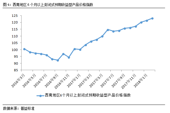 长期理财产品指数上行表现较为稳定。从西南地区价格指数走势来看,2018年2月西南地区6个月以上封闭式预期收益型产品价格指数继续保持了上涨走势,环比上涨1.65点至123.07点,涨幅为1.36%。从2月的变化趋势来看,长期限封闭式预期收益型产品定价继续走高,表明行业看涨银行理财未来的收益走势。考虑到监管层对于非标业务的限制力度,未来银行理财投资非标资产的路径,或仅能依托这类长期限封闭式产品,培养长期持有产品的客户群体有较大的必要性。