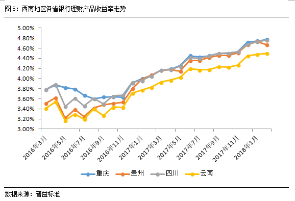 川渝两地理财收益稳中求进,贵州省理财收益明显回落。2月西南地区各省银行理财产品收益表现出了一定的差异,其中,川渝两地产品收益表现依然维持了稳定的上涨走势,但贵州省理财收益却在本月迎来了较为明显的回落。云南省理财产品收益则继续保持微幅上涨的趋势,与其它三省仍有较大差距。从具体收益表现来看,贵州省理财产品收益是唯一回落的地区,环比下降6BP,至4.67%;四川及重庆两省则保持了稳定的上行态势,分别上涨至4.76%和4.77%;相比而言云南省收益仍然明显低于其它三省水平,仅为4.50%,但随着贵州省理财收益的下滑,两省的收益差距大幅缩小。总体来看,西南地区整体收益仍呈现平稳上行走势,预计在季度考核的影响下,3月各省理财产品的收益将继续上涨。