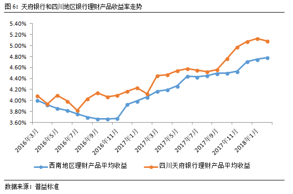 天府银行明显领先西南地区平均收益。进入2018年2月后,四川天府银行理财产品收益继续保持了明显领先幅度,但整体领先幅度有所收窄。从具体表现来看,四川天府银行理财产品平均收益为5.08%,微幅下跌4BP;而西南地区平均收益仅为4.78%,环比上涨3BP。从产品定价角度来看,四川天府银行理财产品收益远高于西南地区平均水平,考虑到目前银行理财产品收益有较强的保障,投资者可直接根据收益高低选择理财产品。