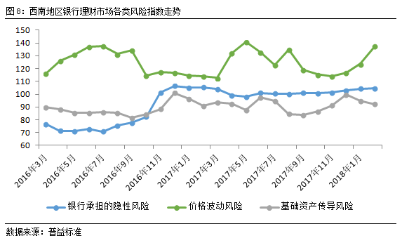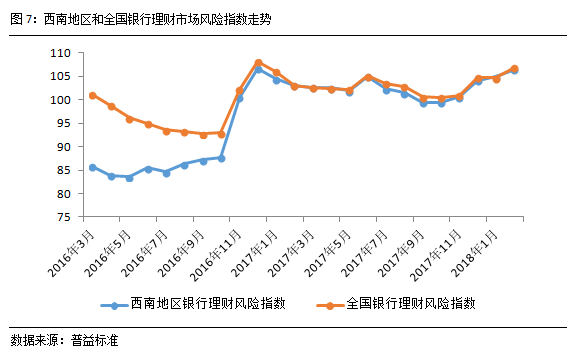 西南地区银行理财风险重回全国平均水平之下。2018年2月,西南地区银行理财风险指数较1月涨幅有所放大,环比上涨1.68点至106.53点。2月西南地区银行理财风险指数上涨的主要原因是价格波动风险大幅上涨,但价格波动风险的变动并非由地区因素造成的。可以看到,全国银行理财风险指数整体涨幅高于西南地区水平且本月西南地区理财风险指数重回全国平均水平之下,凸显西南地区整体风控水平优于全国平均表现。
