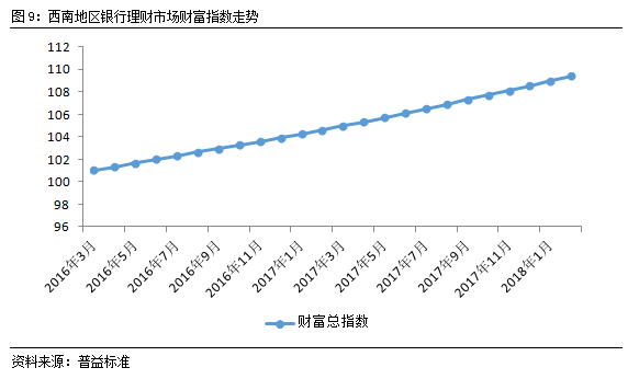 从财富指数来看,西南地区银行理财市场财富指数持续上行,2月环比上涨0.43点至109.40点,凸显出银行理财产品的增值、保值优势。