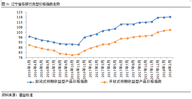 封闭式及开放式理财产品价格指数走势相仿。2月,辽宁省封闭式预期收益型指数及开放式预期收益型指数均呈现了微幅上涨的走势。其中,封闭式预期收益型产品价格指数环比上涨0.49点至118.37点,涨幅较1月微幅放大;开放式预期收益型产品价格指数涨幅却又小幅收窄,环比上涨0.79点至105.31点。再进入2018年后,两类产品价格指数的涨幅都趋于平缓。封闭式产品在经历了2017年12月的收益冲高后,连续两月都处于横盘调整的状态,预计随着3月季末考核的临近整体收益将出现一定幅度的上涨;而开放式预期收益型产品价格指数走势则更为平稳,在近期呈现出收敛的上行走势 。