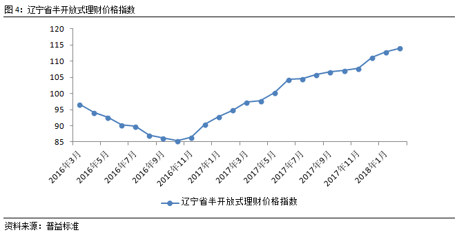 2月辽宁省半开放式理财价格指数持续向上。从辽宁省半开放式理财走势变化来看,2月该指数维持向上趋势,环比上涨1.08点,至114.07点。与2017年下半年相比,辽宁省半开放式理财价格指数在2018年涨幅更为显著,凸显行业看涨未来理财产品收益。虽然开放式产品收益受季末因素影响偏小,但预计2018年3月半开放式理财价格指数仍有明显上行的空间。