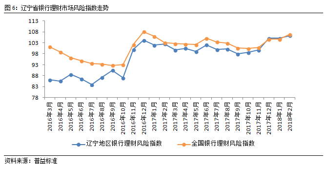 辽宁地区风险回落至全国平均水平之下。从辽宁省银行理财风险指数的走势来看,2月辽宁省银行理财风险指数基本重回全国平均水平之下,环比上涨1.23点,与全国平均水平的差异为0.64点。对比近一年的风险指数来看,当前,辽宁省银行理财风险指数处于近期高点,而价格波动风险成为了造成整体风险指数高企的主要原因。随着资管新规落地的临近,银行理财风险走势与其影响息息相关,不排除资管新规落地后,银行理财风险指数大幅波动的情况。不考虑政策调整因素,在3月季末考核的影响下,价格波动风险或小幅上涨推动整体风险继续上行。