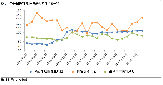 从风险指数看,2月辽宁省银行理财市场风险指数小幅上涨,环比上涨1.23点至106.31点,各类风险走势继续呈现差异化表现。从具体变化值来看,银行承担的隐性风险延续了平稳的走势;银行理财价格波动风险在近期持续冲高,在春节效应的带动下,该指数于2018年2月达到了近一年来的新高点;经历了2017年末基础资产风险暴涨的冲击后,各类基础资产的表现于2018年逐步趋稳,促使基础资产传导风险逐步回落。