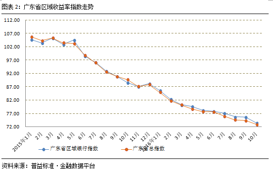 进入10月份后,广东省区域银行指数未能保持9月份指数明显企稳的状态,出现了下滑幅度扩大的表现,环比下降2.06点。本月较多发行主体收益率指数均出现了显著下降,同样,广东省收益率指数延续上个季度明显下滑的趋势,仍未出现翻红表现。不过考虑到年末将近,收益率企稳可能是大多数银行希望看到的结果。而广东省总指数在10月大幅下滑的变现,可能在年末会有所趋缓、稳定。
