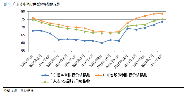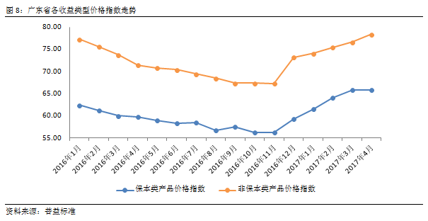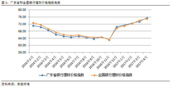 将广东省银行理财价格指数与全国银行理财价格指数对比可以发现,广东省银行理财产品收益在2017年基本与全国理财平均收益持平,反映出广东省资金供求关系与全国平均水平接近,也说明4月的指数涨幅增大符合市场变化。
