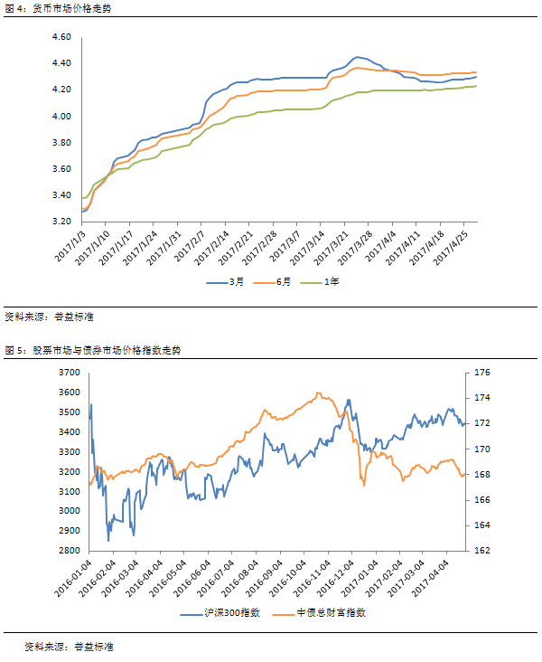 不过宏观经济向好局面并未对中国资本市场形成利好。4月份,在央行缩表和银监会大力推动监管新政的影响下,中国股票市场、债券市场等整体呈震荡下跌态势,这对相关理财产品投资收益造成负面影响。当前,在股市供给不断增长但新增资金有限背景下,股市面临分化,结构性交易机会显现。在金融监管趋严条件下,债市面临去杠杆和委外赎回双重打击,短期难有向好表现。货币市场方面,在央行收紧流动性之际,资金价格明显上升。综合来看,银行理财产品将面临资金端成本上升和资产端收益下降双重压力。