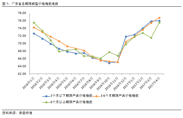4月,广东省各期限类型产品价格指数差异不大,自2016年底开始的收益倒挂现象得到缓解。与3月价格指数相比,4月份6个月以上期限的产品价格指数环比上涨5.17%至75.54点,上升幅度明显;3-6个月期限产品及3个月以下期限产品价格指数分别环比上涨2.22%和0.02%。从各期限类型产品价格指数走势看,短期限产品收益涨势有明显回落,长期限产品收益快速上升,资金错配得到改善,利于金融资源优化配置。