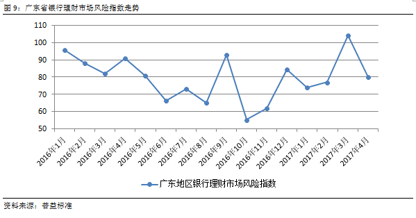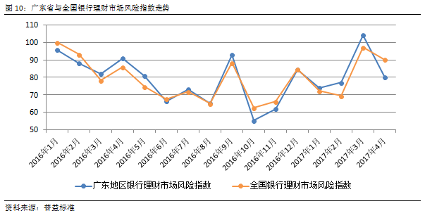 与全国银行理财市场风险指数相比较,过去一年中,广东省银行理财市场风险指数略低于相应时间维度下全国银行理财市场风险指数,显示广东省银行理财风险低于全国平均水平,整体风险暴露程度低,风险可控。但仍需注意在2017年初,广东风险指数仍出现了高于全国的水平。