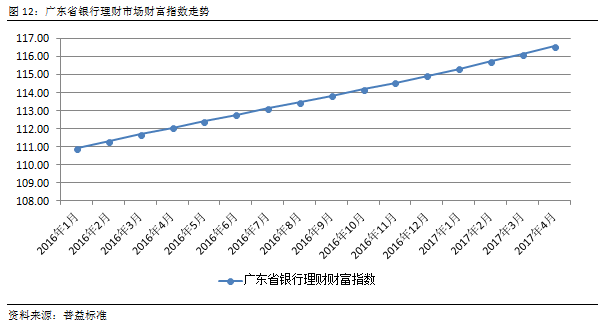 由于银行理财通常以预期收益的形式发行,因此收益与时间呈现正相关关系。由图可见,广东省银行理财市场财富指数随时间推移持续上行,仅有单月增幅差异的变化。2017年4月,广东省财富指数达116.56点,较3月增长0.42点,环比上涨幅度为0.36%,与上月持平。