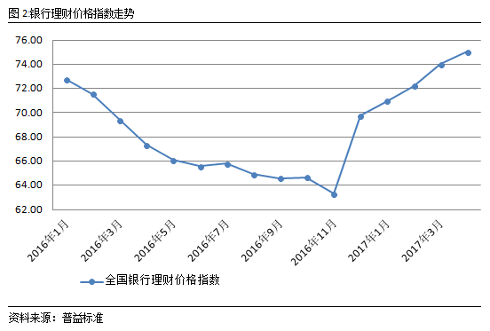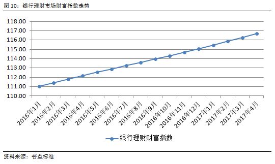 由于银行理财通常以预期收益的形式发行,因此收益与时间呈现正相关关系。由图可见,全国银行理财市场财富指数随时间推移持续上行,仅有单月增幅差异的变化。2017年4月,全国范围财富指数达116.70点,较3月增长0.42点,环比上涨幅度为0.36%,与上月持平。