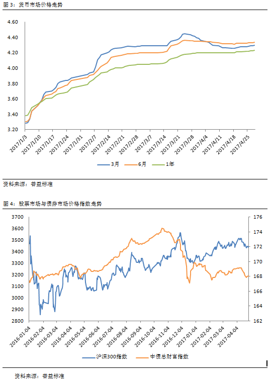 不过宏观经济向好局面并未对中国资本市场形成利好。4月份,在央行缩表和银监会大力推动监管新政的影响下,中国股票市场、债券市场等整体呈震荡下跌态势,这对相关理财产品投资收益造成负面影响。当前,在股市供给不断增长但新增资金有限背景下,股市面临分化,结构性交易机会显现。在金融监管趋严条件下,债市面临去杠杆和委外赎回双重打击,短期难有向好表现。货币市场方面,在央行收紧流动性之际,资金价格明显上升。综合来看,银行理财产品将面临资金端成本上升和资产端收益下降双重压力。