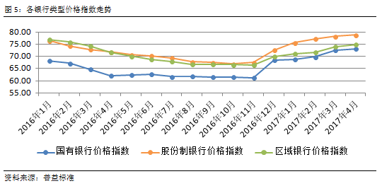 4月,全国各银行类型价格指数仍然呈现上涨趋势,且走势较为接近。其中股份制银行延续了涨幅放缓的趋势,相比3月仅上涨0.66%至78.73点,其走势有见顶向下趋势;国有银行及区域银行在上月明显上行后,本月也均放缓了涨幅且走势较为接近,其中国有银行4月理财价格指数相比3月环比上涨0.85%至73.10点;区域银行4月理财价格指数相比3月环比上涨1.21%至74.90点。从区域银行的收益变化可以看到,在2017年前,区域银行收益指数与股份制银行高度相仿,而进入2017年后区域银行的收益指数则趋近与国有银行。这种现象或表明区域银行在定价层面,2016年更多的是参考股份制银行的定价策略,而2017年中则更多的考虑了国有银行的定价方法。总体来看,在资产端资产收益表现不一情况下,全国各类型银行价格指数维持向上走势主要源于短期偏紧的流动性,未来走势变化依赖于资本市场表现。