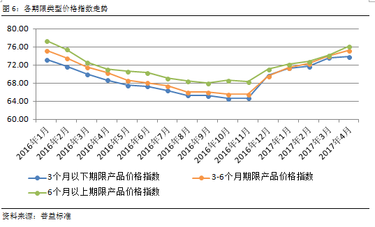 4月,全国各期限类型产品价格指数差异不大,随着长期限理财产品价格指数的大幅上行,自2016年底开始的收益倒挂现象终于被扭转,6个月以上产品价格指数冲上76点。与3月价格指数相比,4月份6个月以上期限的产品价格指数环比上涨2.78%至76.17点,上升幅度有所放大;3-6个月期限产品及3个月以下期限产品价格指数分别环比上涨1.59%和0.31%。从各期限类型产品价格指数走势看,短期限产品收益涨势有明显回落,长期限产品收益快速上升,资金错配得到改善,利于金融资源优化配置。