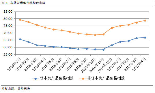 从产品收益类型看,2017年4月理财产品各收益类型财富指数继续增长,其中非保本类产品收益上涨明显。具体来看,非保本类产品财富指数上涨0.44点至117.70点,保本类产品财富指数上涨0.37点至114.97点,相比而言,非保本类产品更具有收益优势。长期而言,由于监管政策要求,未来银行资源将逐步偏向非保本类产品,该类产品对于投资者财富积累的价值更趋凸显。