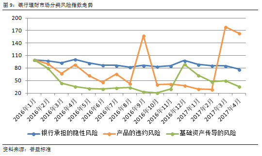 4月,由银行承担的隐性风险小幅下滑,较3月环比下滑9.29%至77.78。与此同时,理财产品违约风险与基础资产传导风险也出现了较明显的下滑,分别降至163.67点和36.73点。当前,在监管政策收紧背景下,保持资本市场稳定,实现银行理财产品合规经营将成为今后发展主基调,可以预计银行理财整体风险仍将进一步下滑。但从银行理财产品预期违约风险来看,近期风险仍处于较高水平。受央行收紧流动性、银监会监管政策等多重因素影响,资金端成本趋于上升、资产端收益短期难有突破,致使银行理财产品违约概率和预期损失上升,进而导致预期违约风险居高不下。