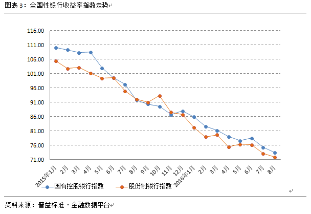 从期限类型来看,在2016年8月,不同期限类型理财产品收益率指数变化有较大差别,其中长期限产品表现出了较为明显的向上趋势,而中短期限产品的下滑幅度也有一定幅度的放缓。从不同发行机构角度来看,8月中,各类发行机构收益率指数均仍然呈现出微幅下滑趋势,下滑幅度较7月有明显的收窄。国有银行长期限保本与非保本产品收益率指数均小幅上升,而中短期限产品收益率指数仍然维持了一定幅度的下滑,其中3-6个月非保本产品收益率指数下滑幅度偏大,环比下滑5.54%。虽然长期限产品指数上涨幅度较为明显,但由于该类产品发行数量较少整体占比极低,因此对国有银行指数影响较小,国有银行指数仍然维持下滑趋势;8月中,股份制银行收益率指数下滑幅度较上月有所收窄,但其保本类产品与非保本类产品仍然呈现较为明显的差异,保本类产品收益率指数持续较明显的下滑表现,而非保本理财产品收益率指数下滑幅度与上月相仿。广东省区域银行保本与非保本指数均呈现了短期较长期下滑幅度更大的表现。3个月以下保本与非保本指数下滑幅度较全国性银行偏大,其中保本3个月下保本指数环比下滑3.31%。而中长期限指数则在本月表现稳定,尤其是6-12个月非保本指数环比大幅上涨3.94%,反映长期限非保本产品收益有所回升。不过由于短期理财产品为目前市场主流产品,因此权重占比更大导致广东省区域银行指数仍然呈现平稳下滑的趋势。