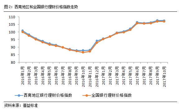 对比西南地区和全国银行理财价格指数可以发现,西南地区银行理财价格指数与全国银行理财指数的走势在2017年呈现了较高程度的趋同表现,但从收益绝对值来看,西南地区银行理财价格指数仍然维持了微幅优势。