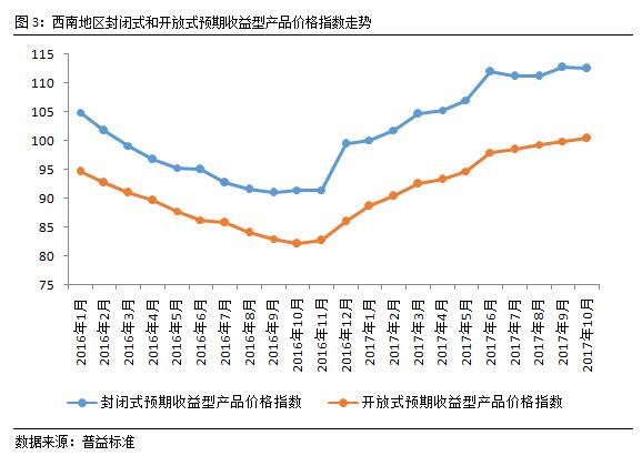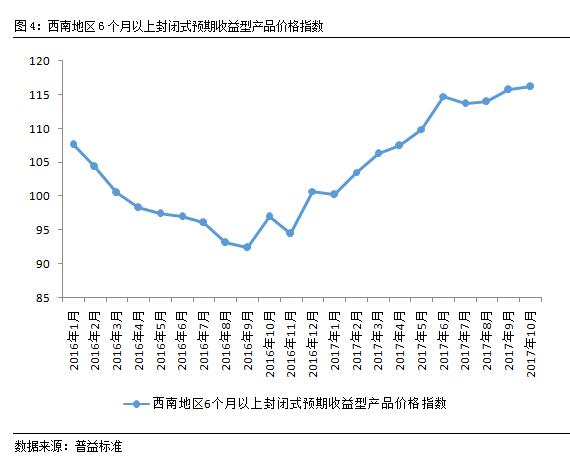 6个月以上封闭式预期收益型指数继续维持上涨走势。从西南地区价格指数走势来看,2017年10月西南地区6个月以上封闭式预期收益型产品价格指数略微高于该地区总指数的涨幅,客观的反应了产品流动性溢价的变化,即产品期限越长,产品收益就越高的逻辑。从具体数值来看,西南地区6个月以上封闭式预期收益型产品价格指数环比上涨0.39点至116.16点,涨幅为0.34%。虽然10月价格指数涨幅有所放缓,但随着年末临近,该指数大概率继续保持上涨态势,但相较短期产品易于定价的特点,长期产品价格指数的涨幅将更加趋于平稳。