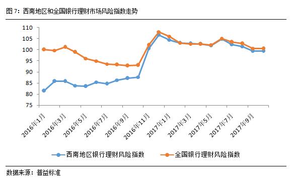 西南地区银行理财风险趋于平稳。2017年10月,西南地区银行理财风险指数基本与9月持平,环比上涨0.02个百分点至99.4点。自2017年年中,央行调整了流动性投放策略后,银行理财产品价格波动风险呈现出了明显的下行态势,推动整体风险持续走低。同时,对比全国平均水平,西南地区银行理财风险指数处于相对低位,表明该地区整体风险控制表现处于全国平均水平之上。当然,与2016年同期相比,西南地区银行理财风险指数仍然有下行空间,随着十九大期间金融监管的重要性再次被强调,预计年末或出现金融监管政策不断落地的情况,严监管环境不会改变,这也导致银行理财业务的规范将进一步明确,整体风险会呈现逐步放缓表现,但短期内受年末效应影响,理财业务风险可能出现小幅上涨的情况。