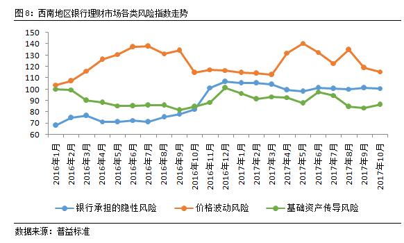 从三类风险指数的走势来看,银行承担的隐性风险表现相对稳定;价格波动风险受央行对流动性调控的影响持续下降;基础资产传导风险因债市波动略有上涨,但并不影响西南地区理财业务风险控制的稳定表现。