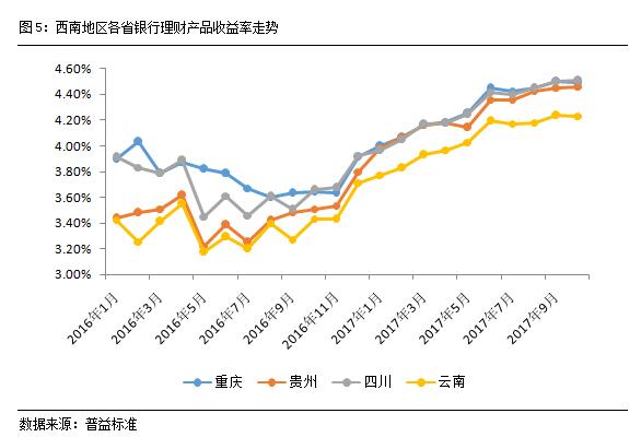 四川省理财产品收益继续领跑西南地区。10月西南地区各省银行理财产品收益涨幅均有所放缓,整体维持平稳走势。总体来看,四川及重庆两地的理财产品收益继续领跑西南地区,其中四川省理财产品平均收益略高于重庆地区;贵州省理财产品收益走势与川渝地区趋同,但仍保持了大约4个BP;而云南省理财产品收益则明显偏低,与四川地区理财产品收益差距仍为28个BP。从具体数值来看,截至10月,四川地区银行理财产品收益为4.51%,环比上涨1个BP;重庆地区银行理财产品收益为4.50%,环比维持不变;贵州地区银行理财产品收益为4.46%,环比上升31个BP;云南地区银行理财产品收益为4.23%,环比保持不变。从西南地区各省理财产品收益可以看出经济越发达的地区,市场竞争就愈加激烈,资金成本也相对更高。