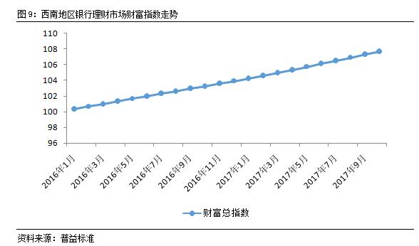 从财富指数来看,西南地区银行理财市场财富指数持续上行,10月环比上涨0.39点至107.69点,凸显出银行理财产品的增值、保值优势。