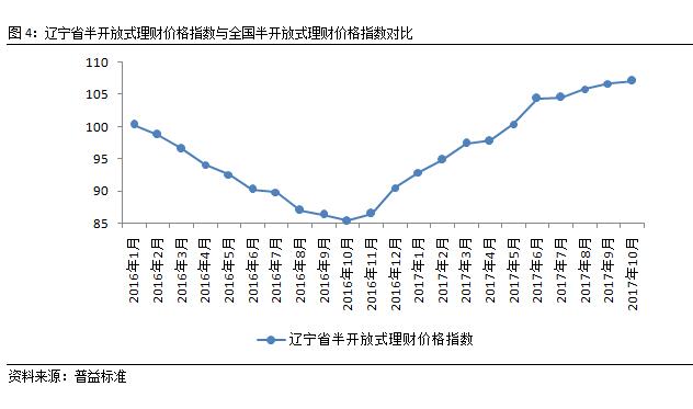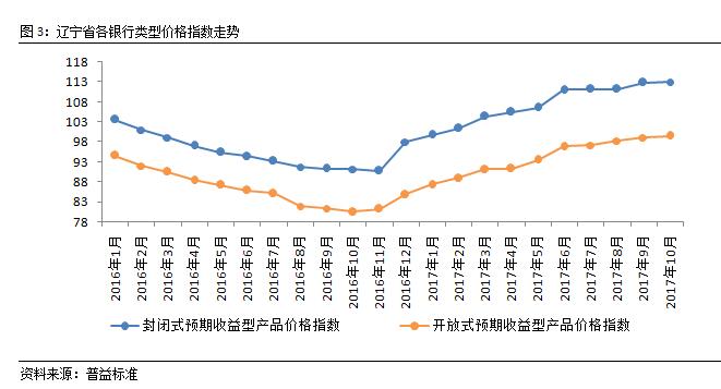 开放式预期收益型产品上涨表现更为平稳,年末各类指数大概率呈现上行走势。10月,辽宁省封闭式预期收益型指数及开放式预期收益型指数走势趋近。其中,封闭式预期收益型产品价格指数环比上涨0.15点至112.98点,整体涨幅有明显收缩;开放式预期收益型产品价格指数维持了较为平稳的上涨趋势,环比上行0.40点至99.51点。自年中过后,辽宁省封闭式预期收益型产品价格指数走势便趋于平缓,在年末临近之际,封闭式产品由于其可控的产品流动性,受时点效应的影响将大于开放式产品,因此该类产品的价格指数在近期仍将保持上行趋势;从近期走势来看,开放式预期收益型产品价格指数的上涨幅度持续收窄,有见顶趋势,不排除此类产品收益在2018年初出现下行表现。