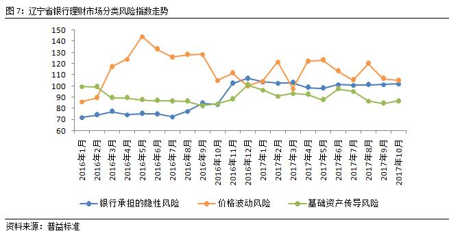 辽宁省银行理财风险微幅上行,整体风控表现仍然优于全国平均水平。在2017年年中过后,辽宁及全国的风险指数均呈现持续下行表现,且辽宁省银行理财风险指数始终低于全国平均水平。10月辽宁省银行理财风险指数有小幅回升表现,环比上涨0.66点至98.57。虽然风险指数小幅上涨,但仍低于全国平均水平。具体来看,辽宁地区风险指数的回升主要受基础资产传导风险的影响,而价格波动风险及银行承担的隐性风险虽然也有小幅波动但整体走势稳定,对于风险指数影响有限。结合十九大期间,监管层多次强调风险控制的重要性来看,监管趋严的大方向不会发生改变,银行理财风险指数从长期来看必将呈现持续下滑的态势。
