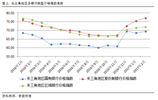 但从横向比较来看,股份制银行和区域银行整体收益维持在相对较高水平,而国有银行产品收益则有相对偏低。由于产品收益维持在较低水平,国有银行在12月受到资金荒的刺激也更为明显,其价格指数出现了大幅攀升,接近股份制银行及区域性银行水平。2017年2月,股份制银行价格指数节节攀升,已达77.10点,超过2016年1月水平,整体收益对投资者有较大吸引力;区域性银行2月的涨幅相对较为平稳,仅环比上涨0.62点,与股份制银行收益差距呈现放大趋势;而国有银行在1月收益小幅回落后,2月收益重新回到16年12月水平,为69.41点。受流动性压力影响,预计3月中,长三角地区国有银行价格指数仍有上升空间。