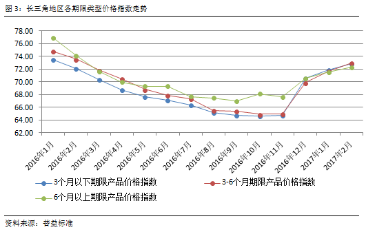 2016年12月前,长三角地区各期限价格指数均呈现下滑表现。3个月以下期限与3-6个月期限产品的价格指数保持相对较高的一致性,差距极小。而6个月以上期限产品的价格指数在2016年7月至11月下滑幅度明显放缓。