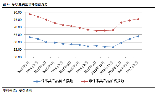 自2016年12月开始,两类产品价格指数迅速上扬,截止2017年2月,保本类产品上涨幅度稳定,缓步攀升至64.07点,超越2016年1月的63.50点;非保本类产品在16年底大幅上涨7.71%后,涨幅明显放缓,其中2月价格指数上升到75.47点,明显高于保本类产品。
